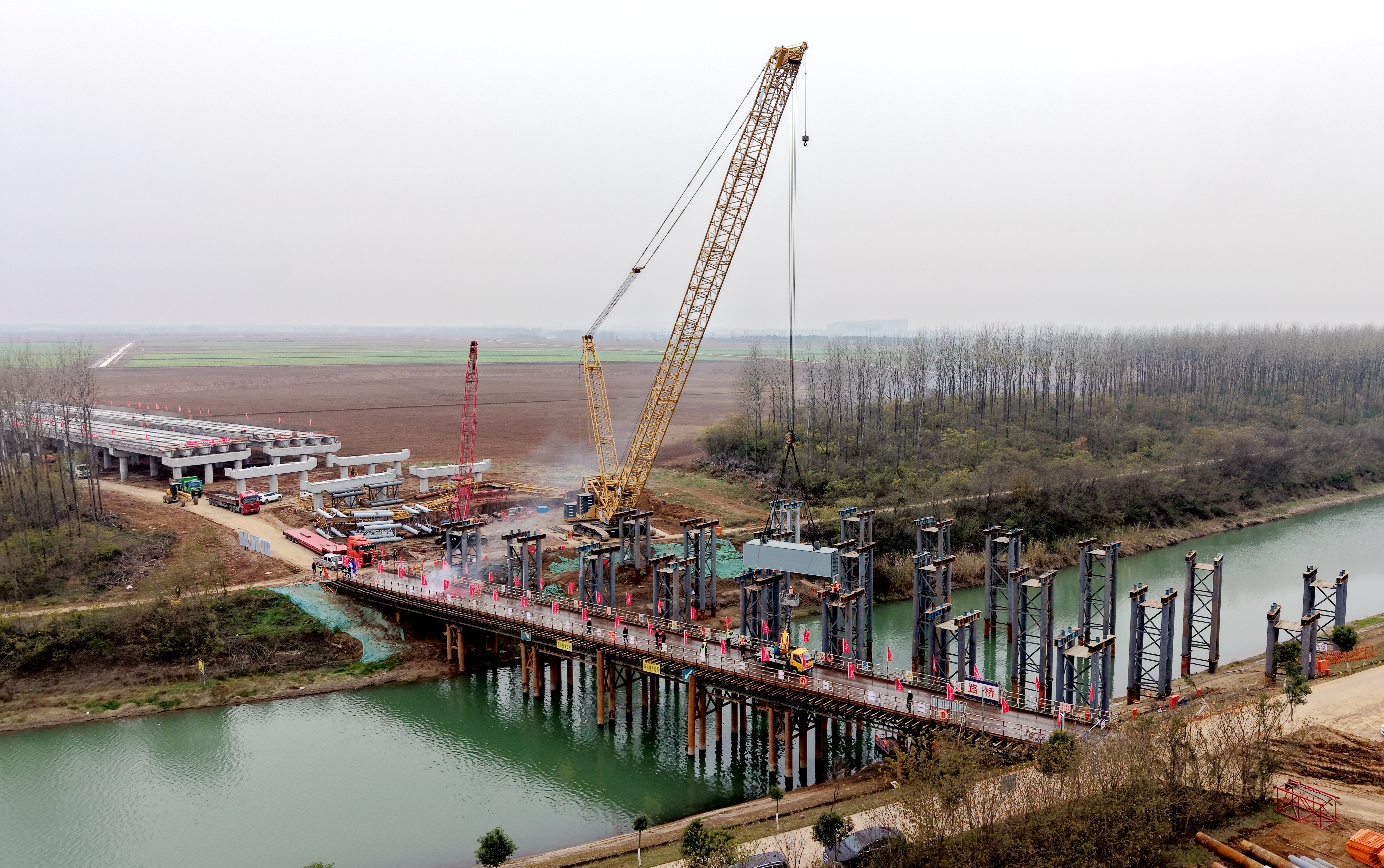 12月10日上午,建工路橋淮桐高速合肥段路基2標(biāo)淠河總干渠大橋主橋首片鋼梁順利完成架設(shè)。
