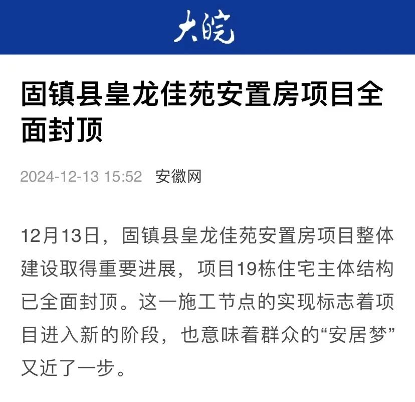 12月13日,安徽水利固鎮(zhèn)縣皇龍佳苑安置房項目全面封頂,受到大皖新聞等媒體關注報道。
