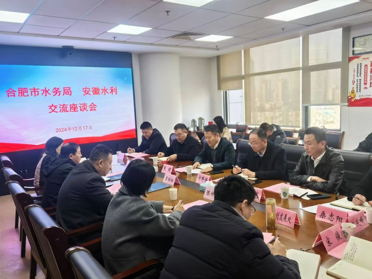 合肥市水務(wù)局領(lǐng)導(dǎo)張吉軍、陳妍彥以及相關(guān)部門負(fù)責(zé)人;安徽水利黨委委員、副總經(jīng)理、工會(huì)主席方邦伍,投資發(fā)展部、市場開發(fā)部、辦公室負(fù)責(zé)人及合肥區(qū)域市場中心、一分公司負(fù)責(zé)同志參加座談。