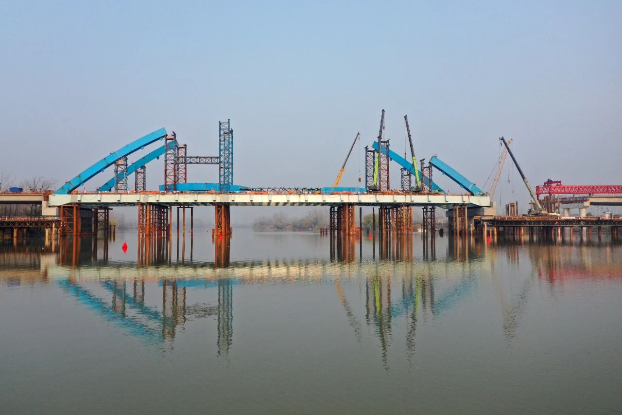 渦河1號大橋主橋鋼板組合梁由拱腳節(jié)段、拱跨鋼梁標(biāo)準(zhǔn)段、和梁跨鋼梁標(biāo)準(zhǔn)段3部分組成,共有47段,采用200t架橋機(jī)架設(shè),目前已全部架設(shè)完成。此次架設(shè)是合龍段鋼梁,梁長9.25米、頂寬45米、高3.5米、重269.4噸。為確保鋼梁順利架設(shè),項(xiàng)目部多次召開專題推進(jìn)會,技術(shù)負(fù)責(zé)人全程盯控,最終圓滿實(shí)現(xiàn)鋼梁架設(shè)節(jié)點(diǎn)目標(biāo)。在鋼梁合龍時(shí),梁(橋)面的臨時(shí)支架和拱肋施工也同步展開。目前,臨時(shí)支架和拱肋的加工已經(jīng)完成60%,預(yù)計(jì)年前完成全部架設(shè)任務(wù)。