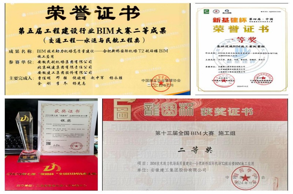 創(chuàng)新驅(qū)動(dòng),科技強(qiáng)企。建工總承包高度重視BIM技術(shù)的融合應(yīng)用,自合肥新橋國際機(jī)場(chǎng)T2航站樓工程項(xiàng)目啟動(dòng)以來,通過多專業(yè)模型深化設(shè)計(jì)、BIM+AR技術(shù)、研發(fā)智慧建造云平臺(tái)等舉措解決設(shè)計(jì)圖紙各專業(yè)碰撞,實(shí)現(xiàn)BIM模型可視化、質(zhì)量驗(yàn)評(píng)、計(jì)量支付、進(jìn)度管控和安全管理的全面聯(lián)動(dòng),為項(xiàng)目建設(shè)提質(zhì)增速提供堅(jiān)實(shí)保障。今年以來,項(xiàng)目先后獲評(píng)第五屆工程建設(shè)行業(yè)BIM大賽二等成果、“新基建杯”BIM大賽一等成果、“龍圖杯”BIM大賽二等成果、第七屆“優(yōu)路杯”全國BIM技術(shù)大賽銀獎(jiǎng)5項(xiàng)國家級(jí)獎(jiǎng)項(xiàng)。