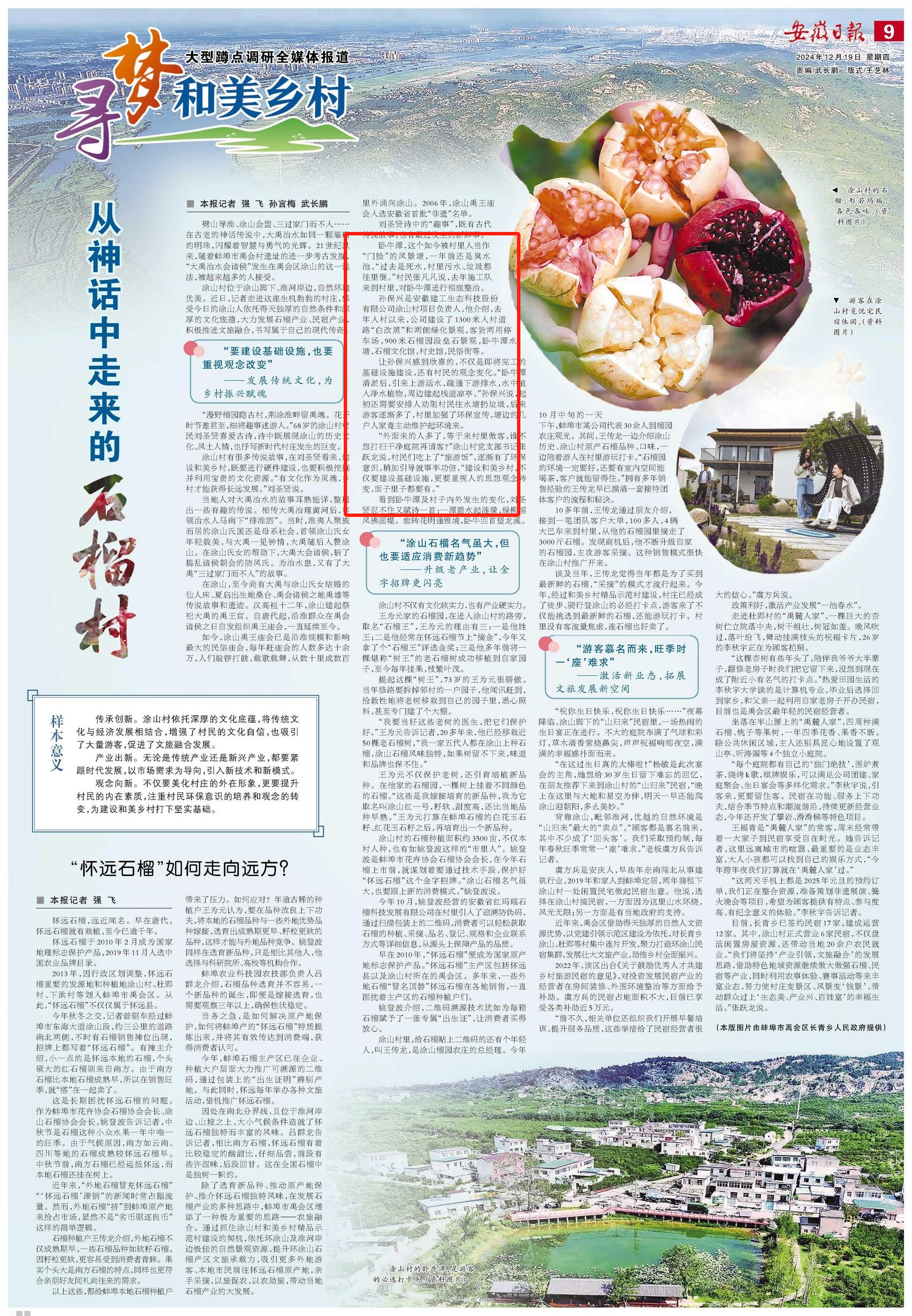 文中指出,項目開工以來,公司建設(shè)了1300米入村道路“白改黑”和兩側(cè)綠化景觀,客貨兩用停車場,900米石榴園段壘石景觀,臥牛潭水塘,石榴文化館,村史館,民俗街等,讓臥牛村的面貌煥然一新。目前,項目建設(shè)已接近尾聲,效果也已逐漸凸顯,不僅基礎(chǔ)設(shè)施更加完善、環(huán)境更加怡人,游客也越來越多,為推動涂山村農(nóng)文旅深度融合發(fā)展做出了重要貢獻。
