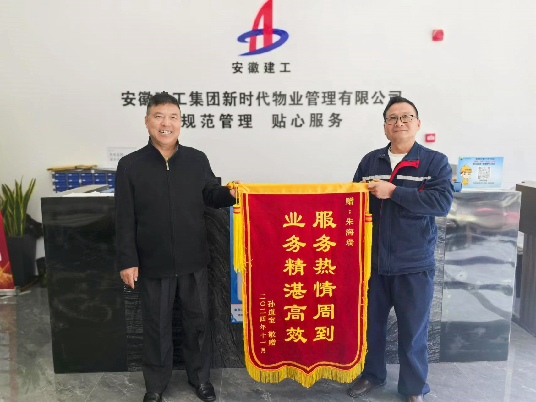 近日,17-403的業(yè)主滿懷感激地將一面寫有“服務(wù)熱情周到,業(yè)務(wù)精湛高效”的錦旗送到了物業(yè)服務(wù)中心,親自交到了朱海瑞師傅的手中,這背后是朱海瑞師傅日復一日的辛勤付出。
