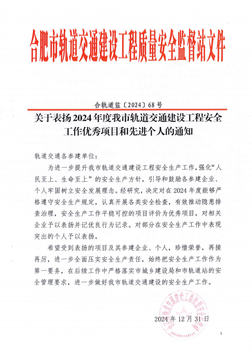 近日,建工路港軌道交通7號(hào)線項(xiàng)目榮獲2024年度合肥市軌道交通建設(shè)工程“安全工作優(yōu)秀項(xiàng)目”稱號(hào),項(xiàng)目經(jīng)理被授予“安全工作先進(jìn)個(gè)人”稱號(hào)。