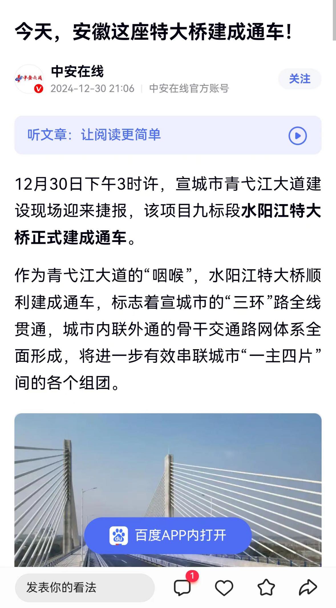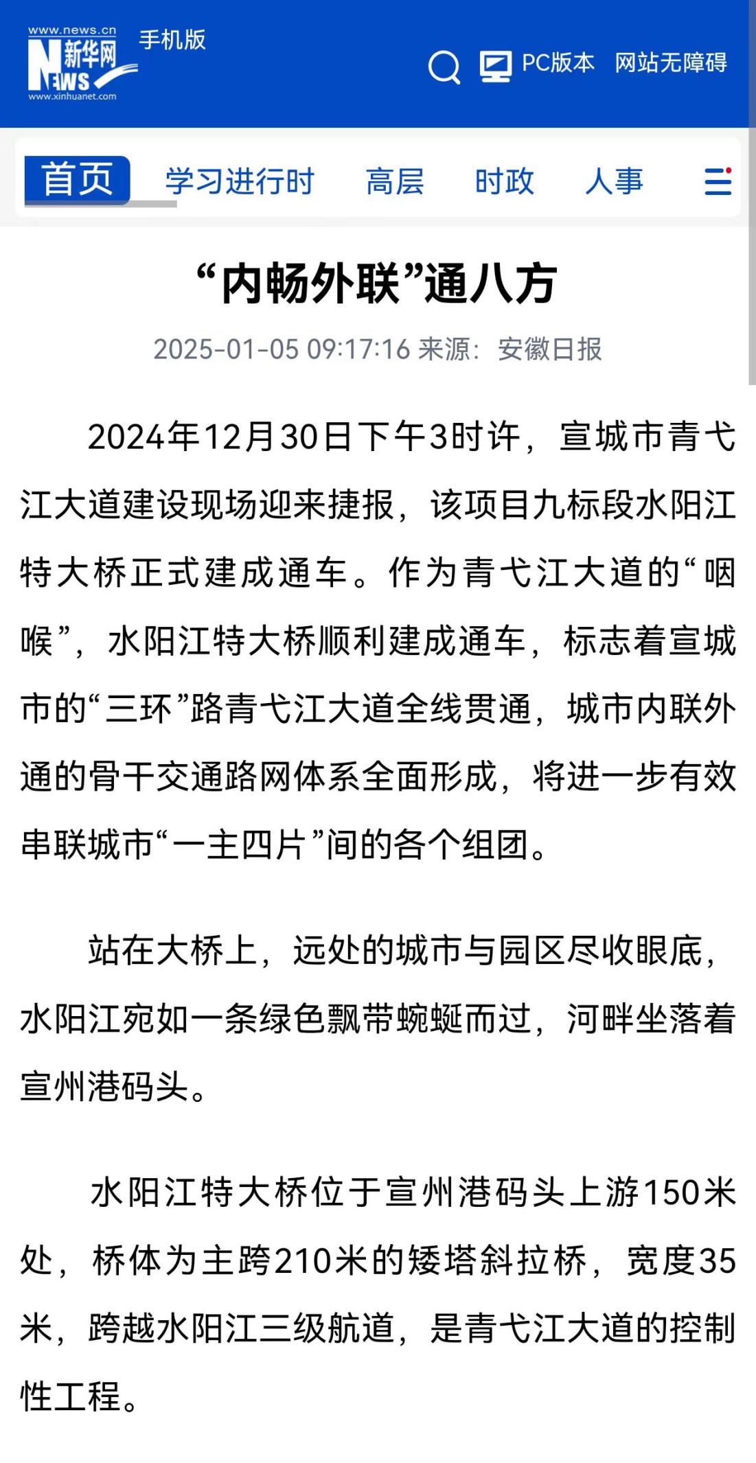 近日,建工路港承建的宣城市青弋江大道水陽江特大橋正式建成通車,受到安徽日報紙媒、新華網(wǎng)、中安在線等多個主流媒體關注報道。