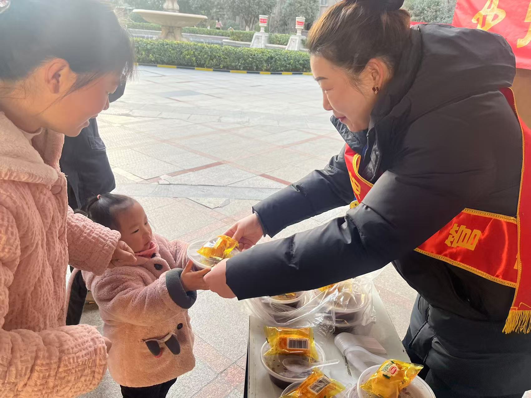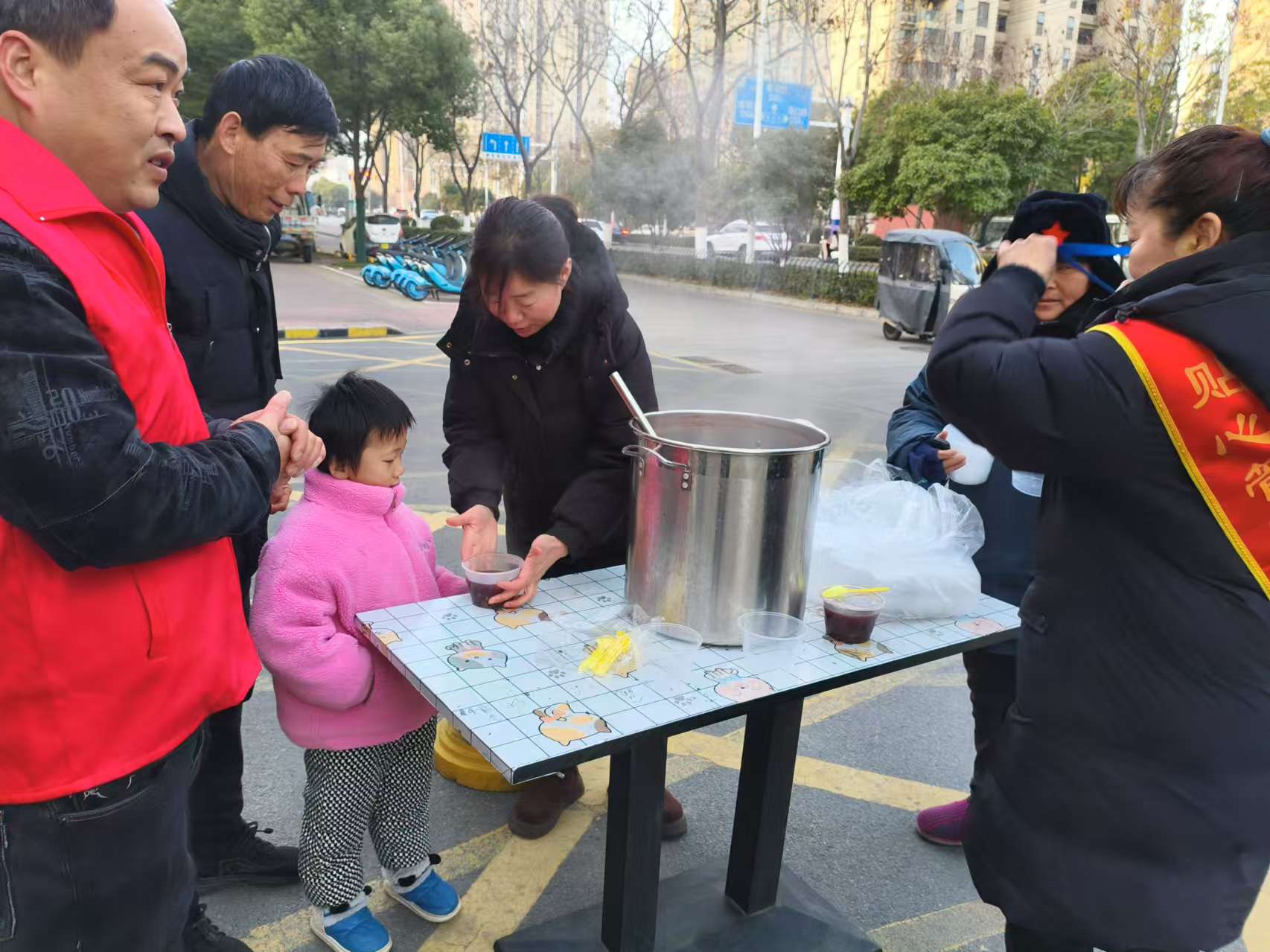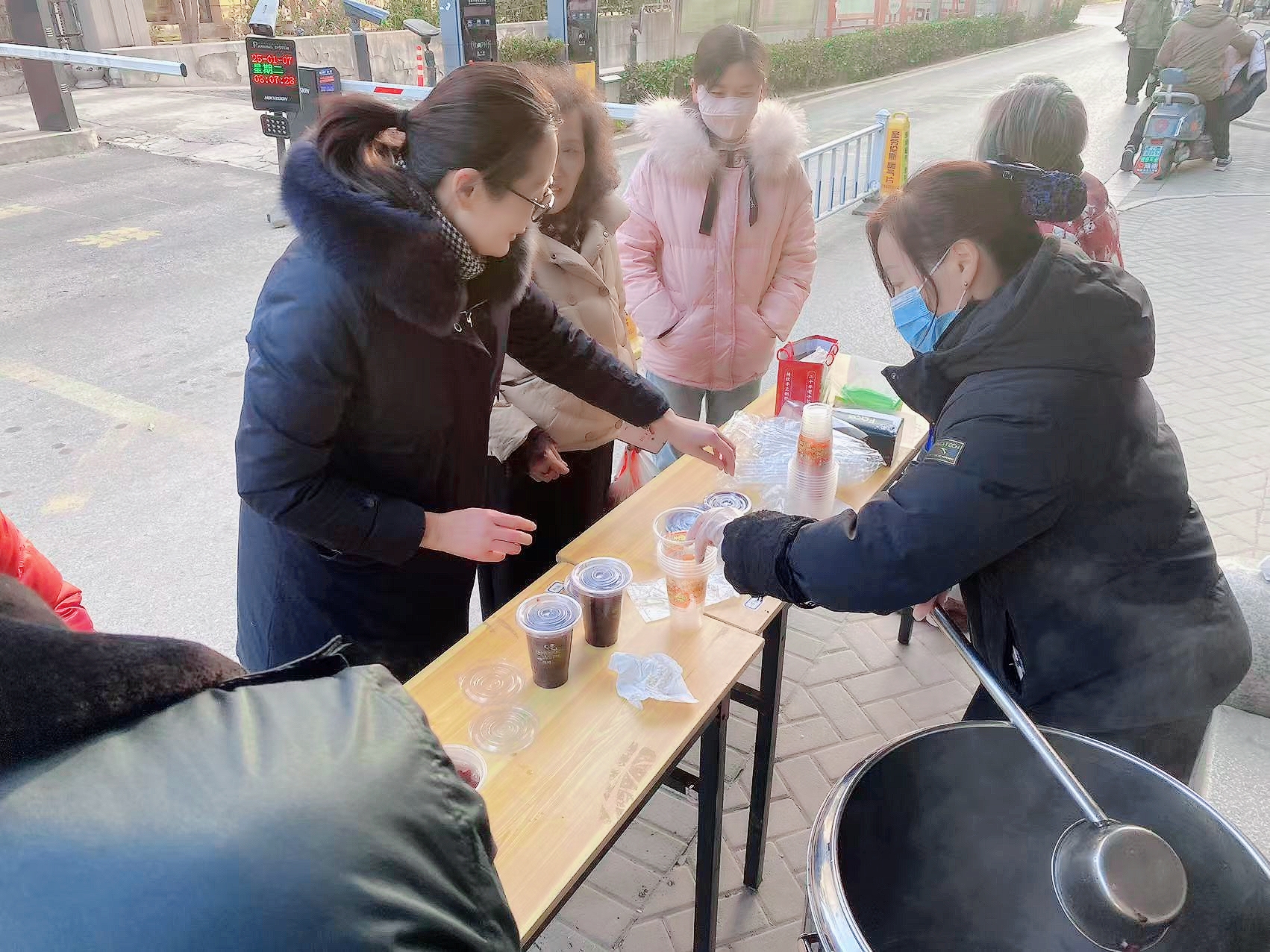居民們紛紛聞?dòng)嵹s來(lái),老人們帶著孩子,年輕人陪著長(zhǎng)輩,大家歡聲笑語(yǔ),匯聚成一片歡樂(lè)的海洋。物業(yè)工作人員熱情地為居民們盛上一碗碗熱氣騰騰的臘八粥,還細(xì)心地準(zhǔn)備了一次性餐具,方便大家食用?,F(xiàn)場(chǎng)暖意融融,鄰里間的問(wèn)候交談聲此起彼伏,情誼在這一碗粥中升溫。