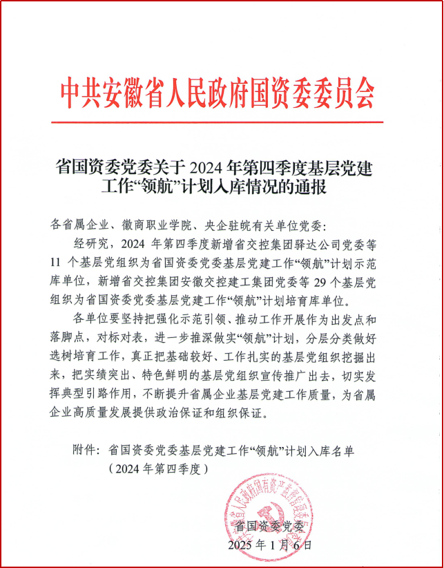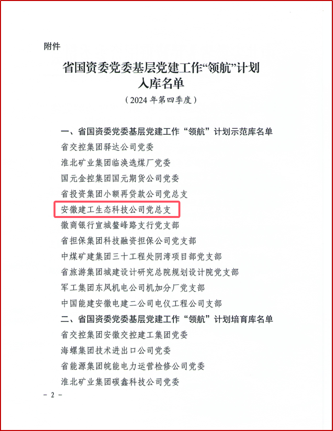 1月6日,從安徽省國資委傳來喜訊,安徽水利所屬安徽建工生態(tài)科技公司黨總支成功入選安徽省國資委2024年第四季度基層黨建工作“領(lǐng)航”計(jì)劃示范庫。