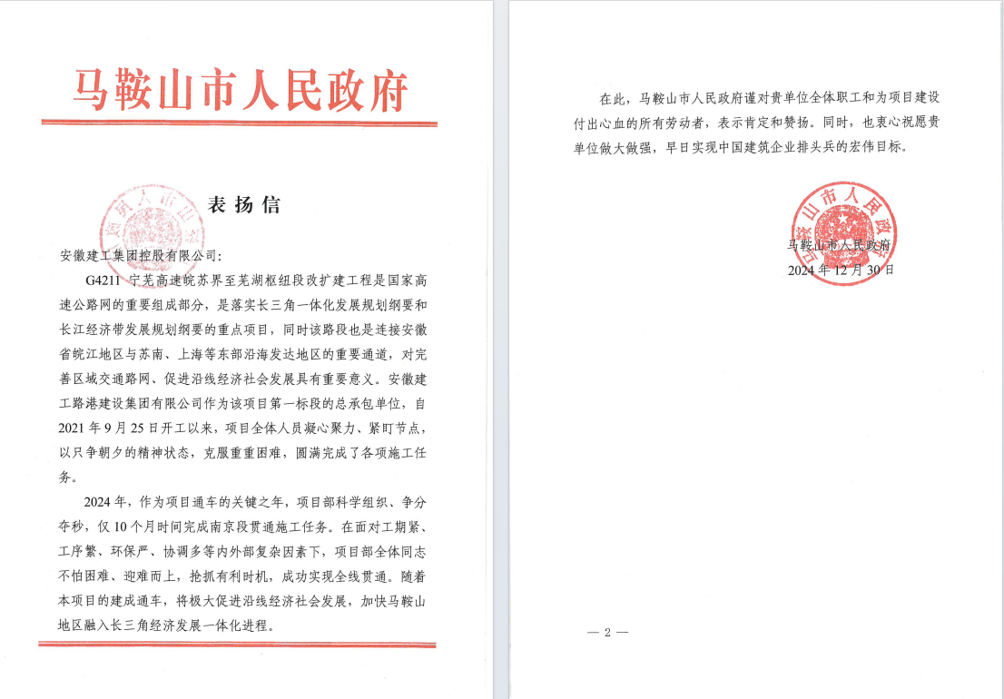 2024年12月30日,項(xiàng)目部收到了來(lái)自馬鞍山市人民政府的表?yè)P(yáng)信,表?yè)P(yáng)信中對(duì)安徽建工集團(tuán)及安徽建工路港建設(shè)集團(tuán)有限公司全體職工和為項(xiàng)目建設(shè)付出心血的所有勞動(dòng)者表示了肯定和贊揚(yáng)。這是對(duì)項(xiàng)目團(tuán)隊(duì)辛勤付出的最大的肯定,也是對(duì)他們專業(yè)精神和敬業(yè)態(tài)度的高度認(rèn)可。這份表?yè)P(yáng)信不僅是一份榮譽(yù),更是一種激勵(lì)。這份表?yè)P(yáng)信的背后,是項(xiàng)目團(tuán)隊(duì)無(wú)數(shù)個(gè)日夜的堅(jiān)守和付出,為當(dāng)?shù)亟?jīng)濟(jì)社會(huì)發(fā)展做出重要貢獻(xiàn),也為集團(tuán)、公司在今后的項(xiàng)目建設(shè)中積累了寶貴的經(jīng)驗(yàn),樹立了良好的品牌形象。