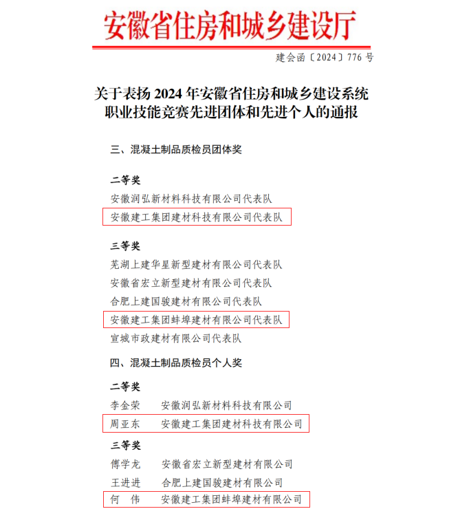 近日,由安徽省住房和城鄉(xiāng)建設(shè)廳主辦的2024年安徽省住房和城鄉(xiāng)建設(shè)系統(tǒng)職業(yè)技能競賽——混凝土制品質(zhì)檢員競賽成績公布。建工建材代表隊和建工蚌埠建材代表隊分別榮獲團體獎二等獎和三等獎,周亞東、何偉分別獲得個人二等獎和三等獎。