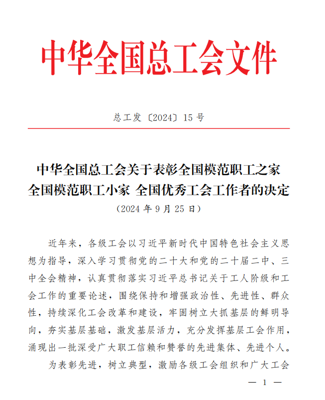 “全國模范職工之家”是全國工會系統(tǒng)表彰先進集體的最高榮譽,由中華全國總工會設(shè)立,是對基層工會工作的最高褒獎和肯定。
