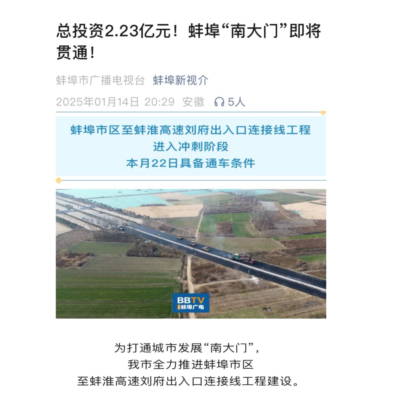 1月14日上午,安徽水利Y011蚌淮高速項(xiàng)目部全線路面工程圓滿完工,預(yù)計(jì)本月22日基本具備通車條件,受到蚌埠日?qǐng)?bào)紙媒、蚌埠市廣播電視臺(tái)等主流媒體關(guān)注報(bào)道。