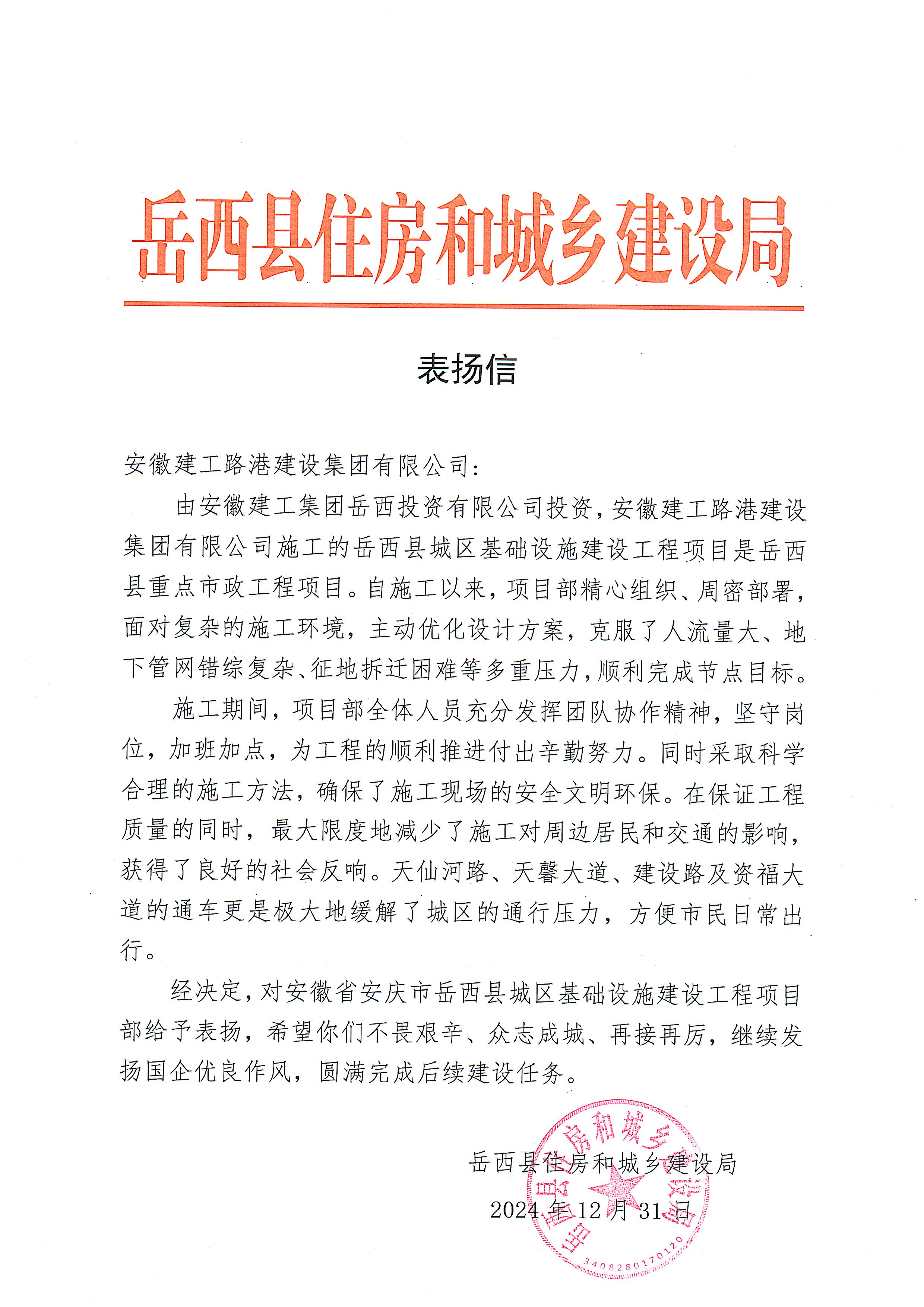 近日,建工路港岳西縣城區(qū)基礎設施建設項目收到岳西縣住房和城鄉(xiāng)建設局發(fā)來的表揚信。