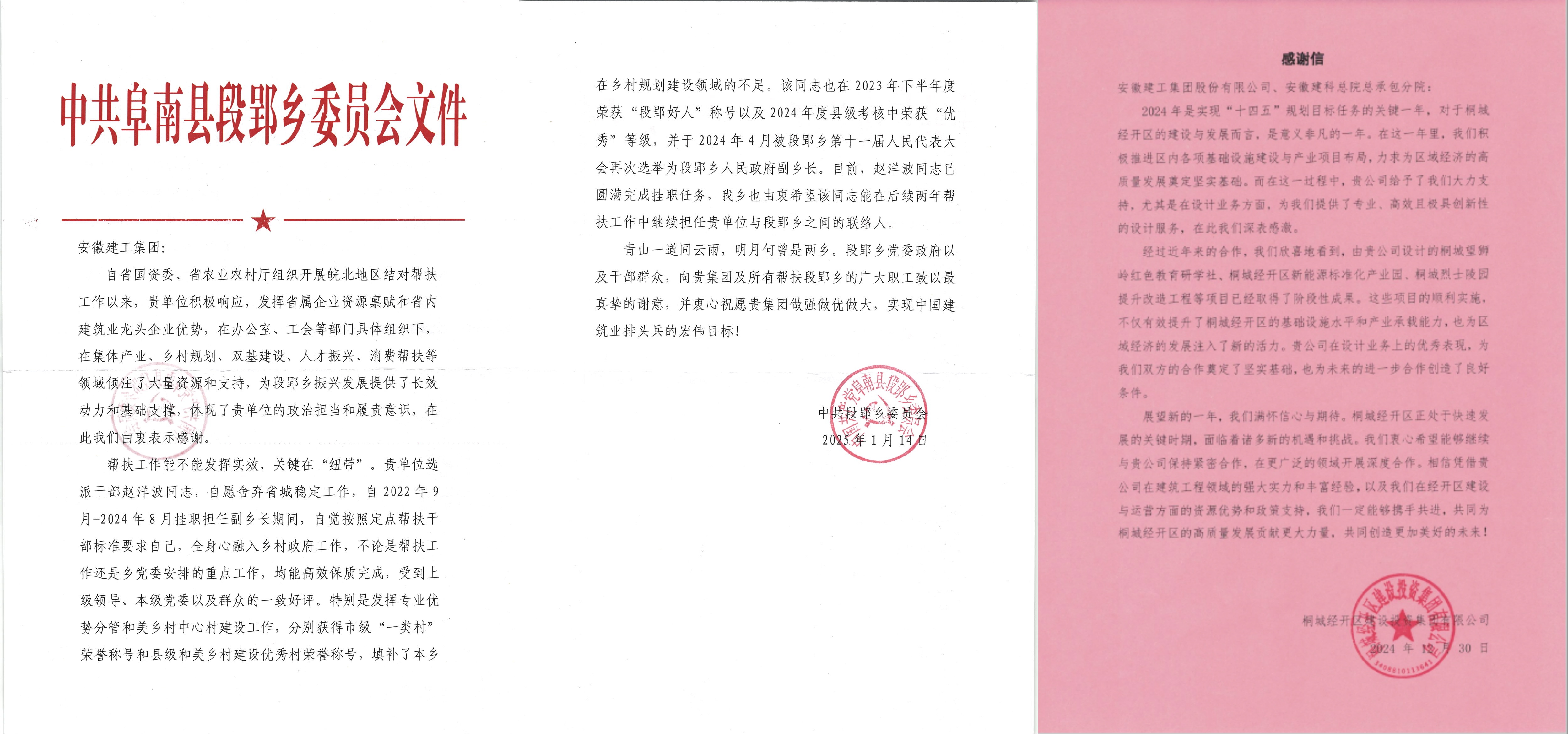 近日,在段郢鄉(xiāng)黨委政府給安徽建工集團(tuán)的感謝信中,對(duì)安徽建科選派干部趙洋波同志在掛職期間的工作表現(xiàn)給予高度贊揚(yáng);在桐城經(jīng)開區(qū)建設(shè)投資集團(tuán)有限公司發(fā)來(lái)的感謝信中,對(duì)安徽建科總承包分院在桐城望獅嶺紅色教育研學(xué)社、桐城經(jīng)開區(qū)新能源標(biāo)準(zhǔn)化產(chǎn)業(yè)園等項(xiàng)目中提供的專業(yè)、高效且具有創(chuàng)新性的設(shè)計(jì)服務(wù)和質(zhì)量給予高度認(rèn)可。