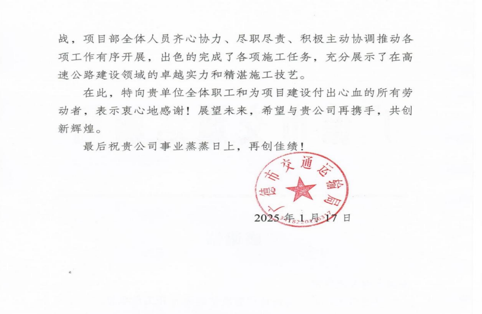 信中指出,自開工以來,項目團隊凝心聚力、緊盯節(jié)點,以只爭朝夕的精神狀態(tài),克服重重困難,在合同工期內完成各項建設任務,為高速公路建成通車提供了堅實有力的保障,受到屬地和各參建方的一致好評,充分展示了在高速公路建設領域的卓越實力和精湛施工技藝。