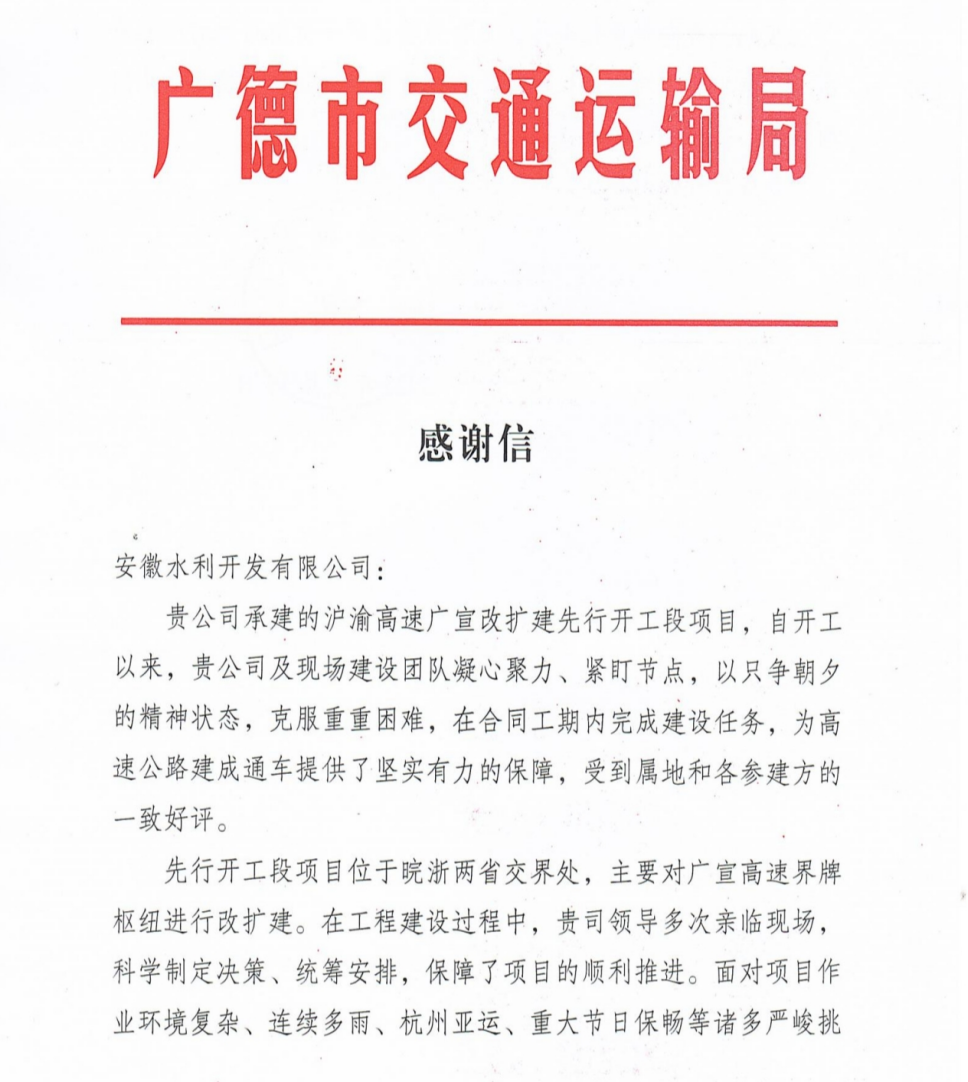 近日,安徽水利廣宣項目收到來自廣德市交通運輸局的感謝信,感謝項目對廣宣高速建設和經濟社會發(fā)展所作出的努力和貢獻。