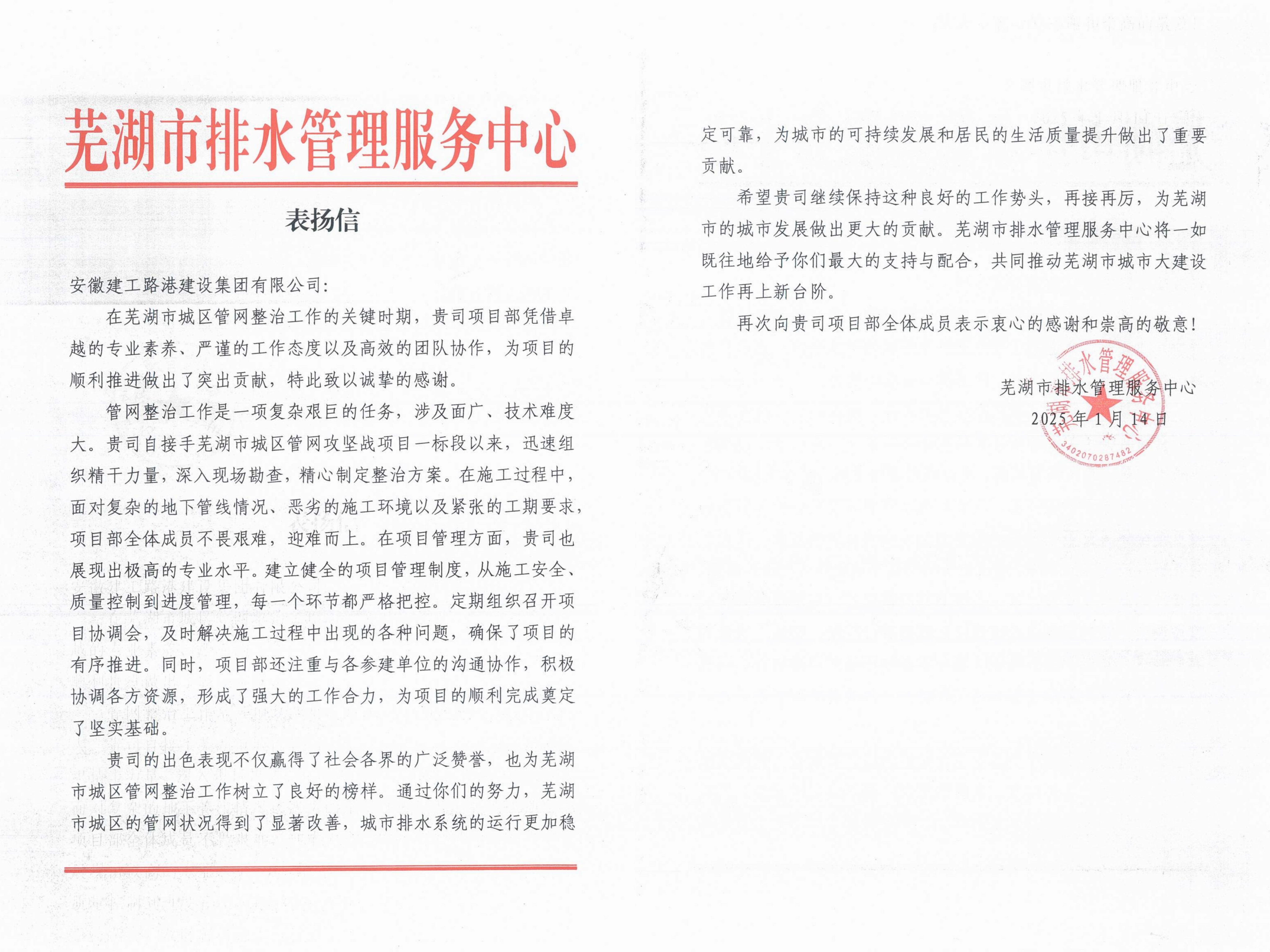 近日,建工路港蕪湖市城區(qū)管網(wǎng)攻堅戰(zhàn)項目(一標(biāo)段)喜獲業(yè)主單位蕪湖市排水管理服務(wù)中心的表揚信,這是對項目團隊辛勤付出和成績的肯定。