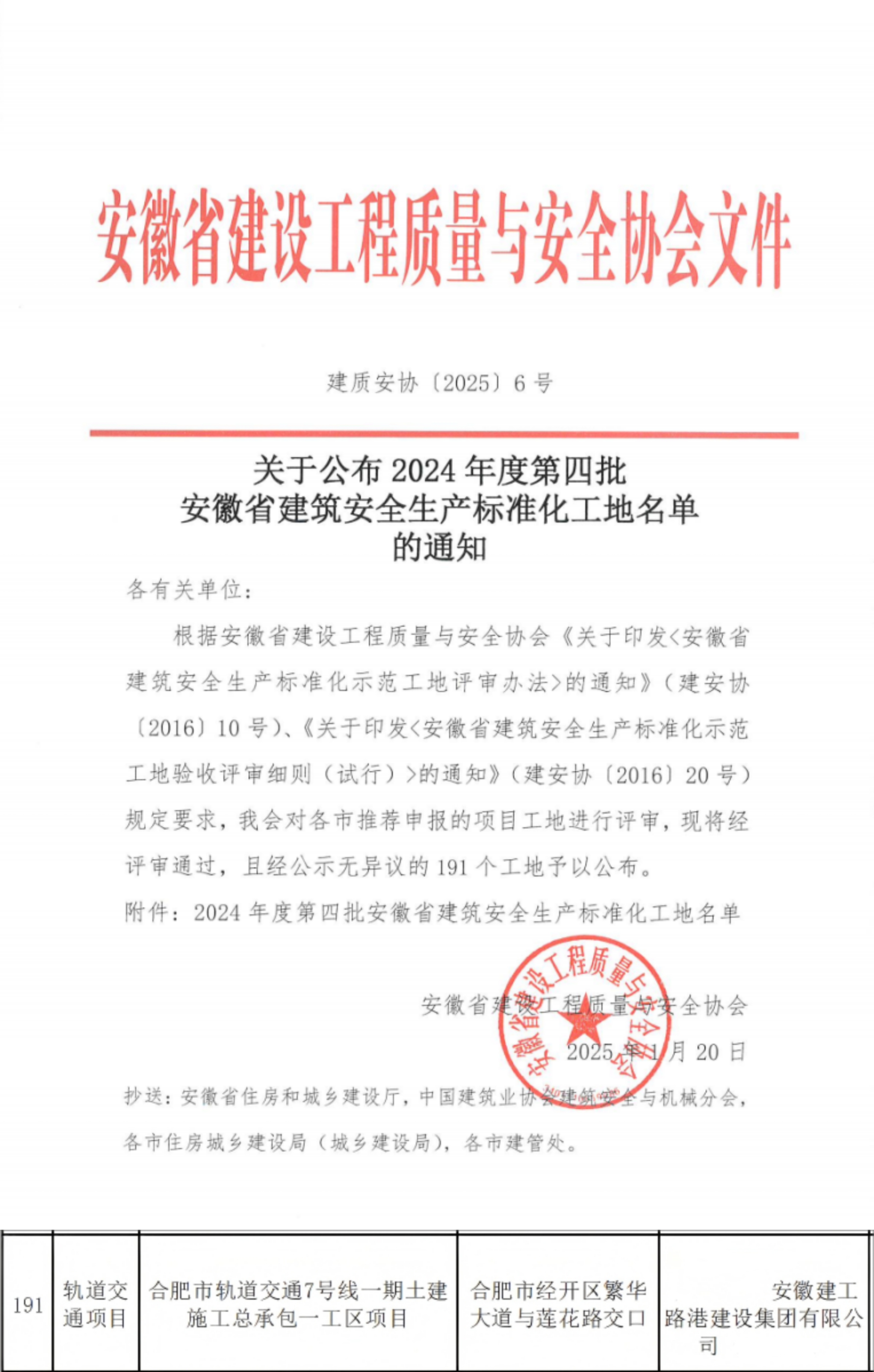近日,從安徽省建設工程質量與安全協(xié)會傳來喜訊,建工路港承建的合肥市軌道交通7號線項目榮獲2024年度第四批“安徽省建筑安全生產(chǎn)標準化工地”稱號,是此次唯一獲得該稱號的軌道交通工程項目。