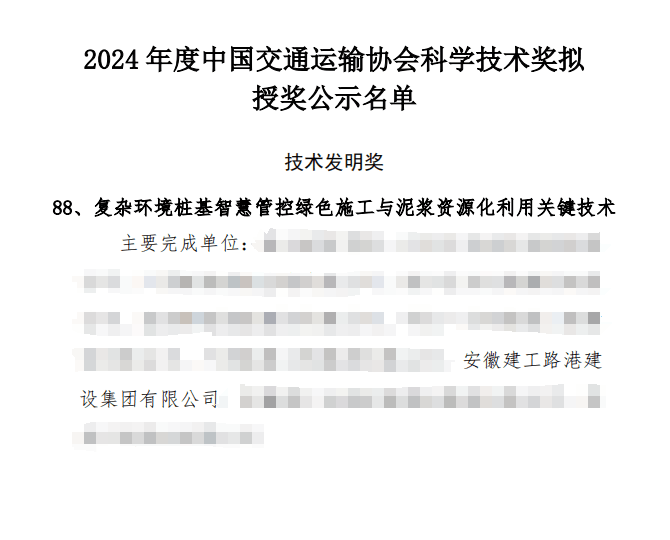 近日,中國交通運(yùn)輸協(xié)會公布了2024年度科學(xué)技術(shù)獎獲獎名單,建工路港“復(fù)雜環(huán)境樁基智慧管控綠色施工與泥漿資源化利用關(guān)鍵技術(shù)”榮獲技術(shù)發(fā)明獎一等獎。