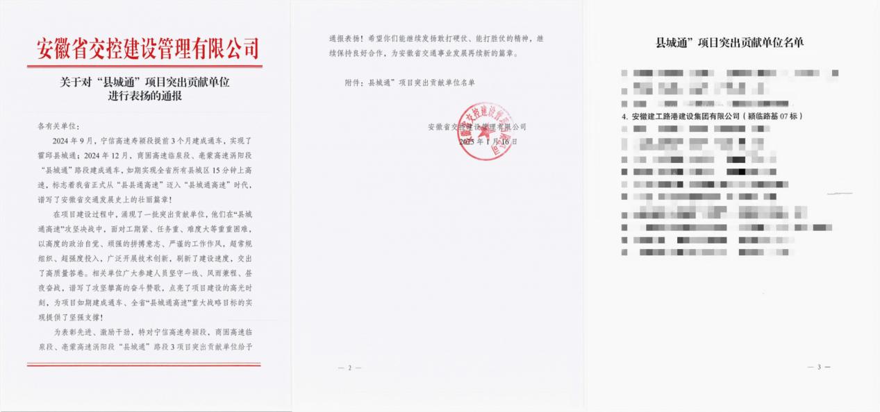 近日,建工路港合周高速潁臨路基07標(biāo)“縣城通”段項(xiàng)目收到來(lái)自業(yè)主單位安徽省交控建設(shè)管理有限公司的通報(bào)表?yè)P(yáng)。