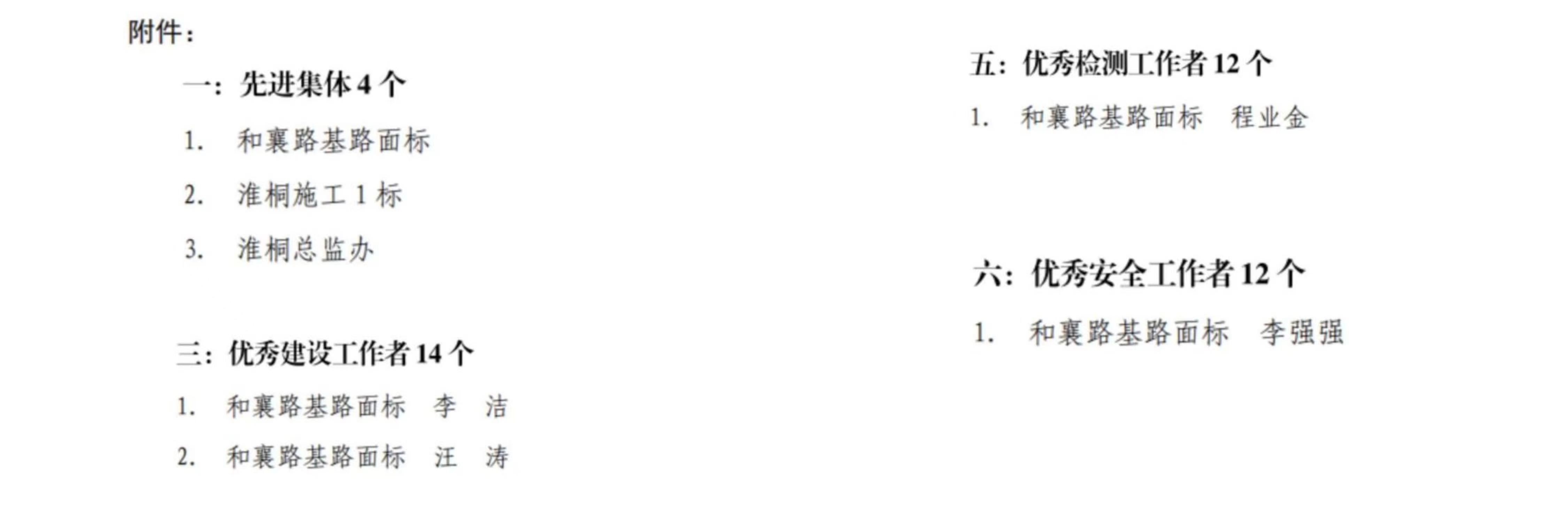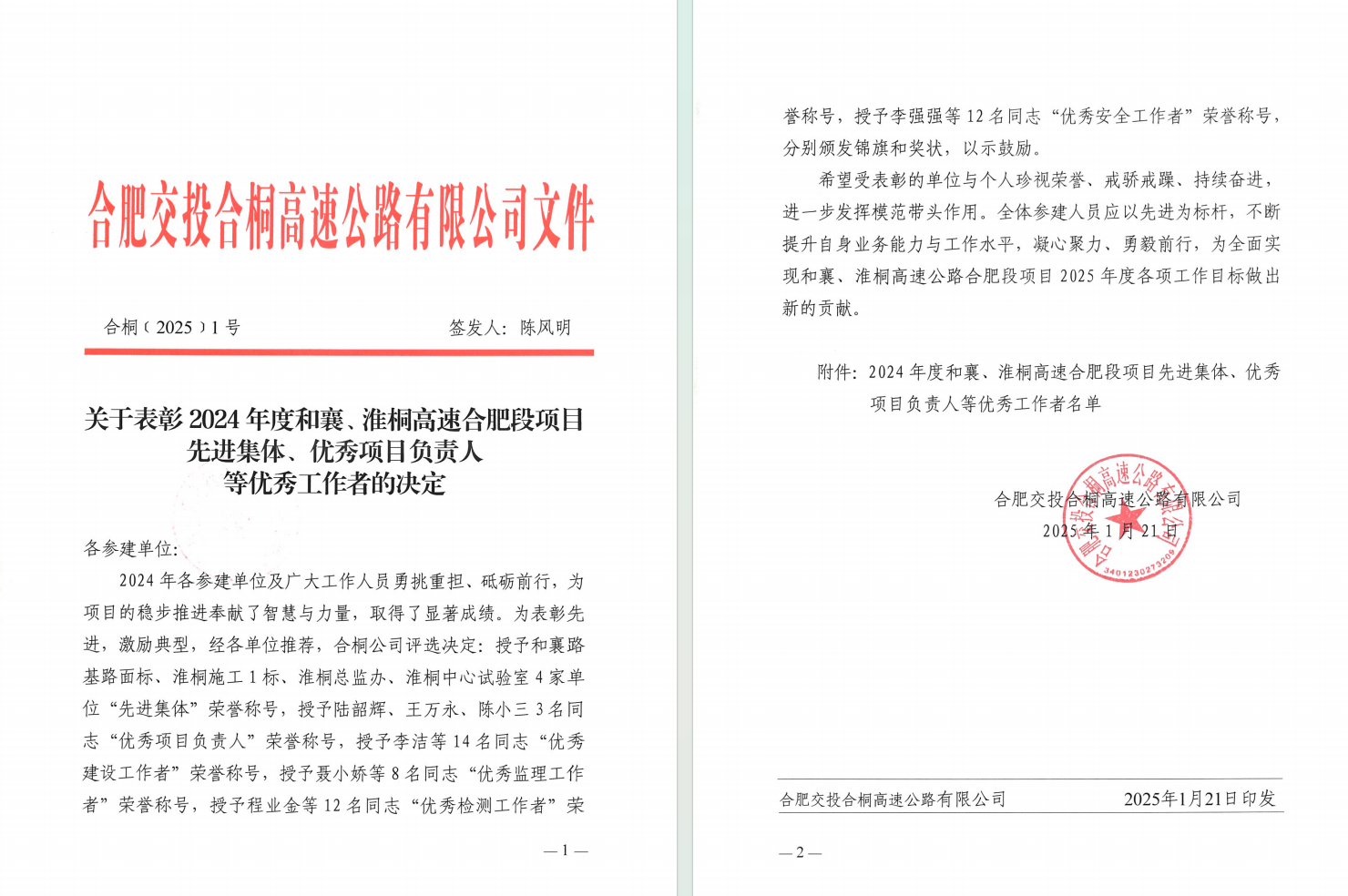 近日,由合肥交投合桐高速公路有限公司舉辦的和襄、淮桐高速合肥段2024年度工作總結(jié)大會(huì)暨表彰大會(huì)上,合桐公司對和襄高速項(xiàng)目的成績和表現(xiàn)給予了高度認(rèn)可。建工路港和襄高速項(xiàng)目在四季度暨年度參建單位綜合考評(píng)中以90.37分的佳績榮獲第一名,獲得“先進(jìn)集體”稱號(hào)。李潔、汪濤兩位同志被授予“優(yōu)秀建設(shè)工作者”稱號(hào);程業(yè)金同志被授予“優(yōu)秀檢測工作者”稱號(hào);李強(qiáng)強(qiáng)同志被授予“優(yōu)秀安全工作者”稱號(hào)。