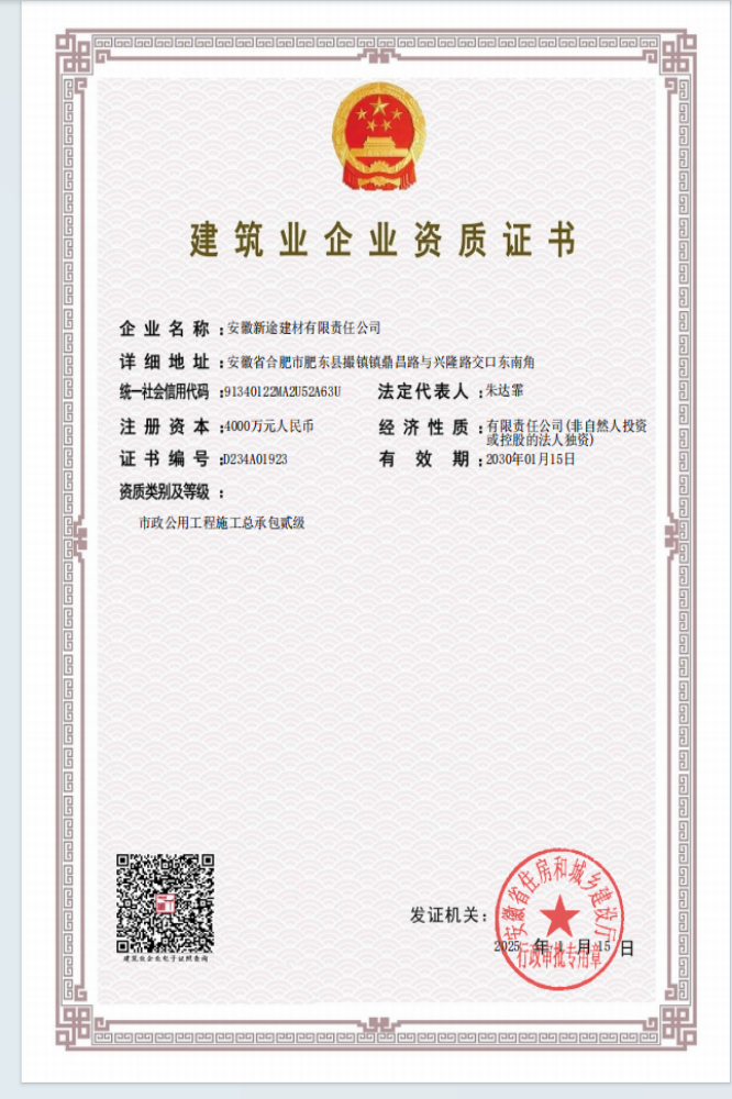安徽新途建材有限責任公司喜獲安徽省住房和城鄉(xiāng)建設(shè)廳正式批準,市政公用工程施工總承包二級資質(zhì)順利通過審核,標志著新途建材在市政公用工程領(lǐng)域邁上了新的臺階,市場競爭力得到顯著提升,為公司的業(yè)務(wù)范圍拓展奠定了堅實的基礎(chǔ)。