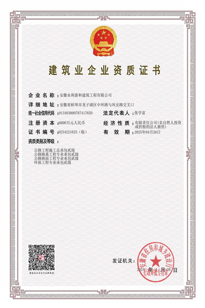 經(jīng)建筑主管部門核準,嘉和建筑成功獲批公路工程施工總承包貳級、公路路基工程專業(yè)承包貳級、公路路面工程專業(yè)承包貳級、環(huán)保工程專業(yè)承包貳級資質(zhì)。