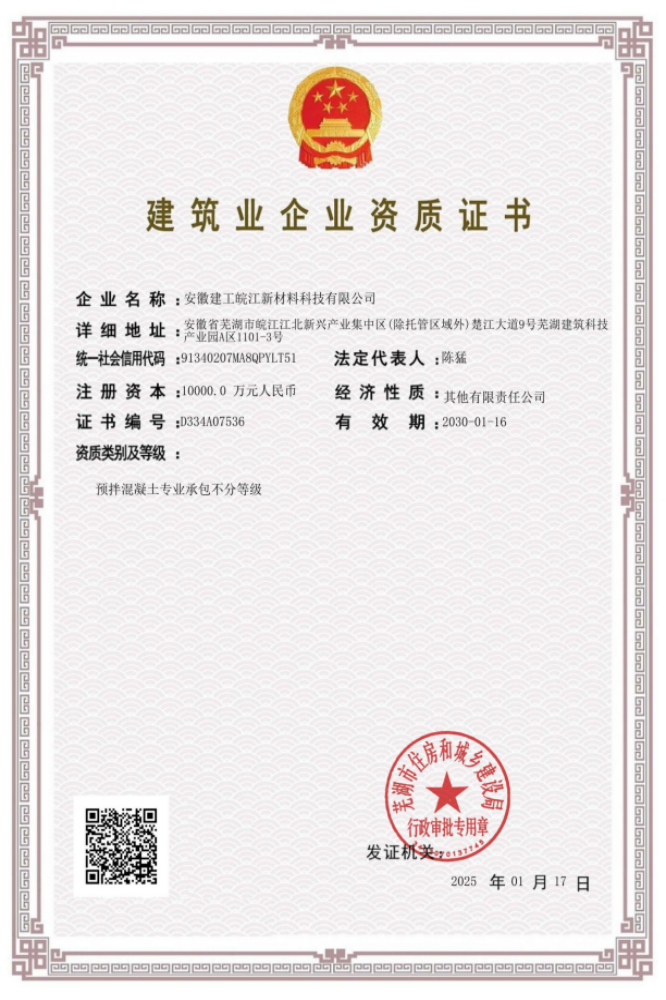 安徽建工皖江新材料科技有限公司經(jīng)蕪湖市住房和城鄉(xiāng)建設(shè)局正式批準,獲得預(yù)拌混凝土專業(yè)承包資質(zhì),此次資質(zhì)的取得,不僅代表皖江新材料從建設(shè)期到運營期的轉(zhuǎn)型邁出了重要一步,更為公司在蕪湖預(yù)拌混凝土市場的深入開拓提供了新機遇。