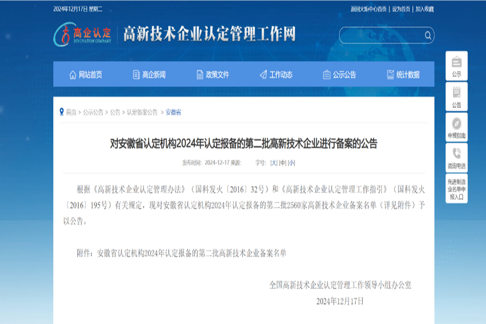 國家高新技術(shù)企業(yè)認定管理工作網(wǎng)發(fā)布《對安徽省認定機構(gòu)2024年認定報備的第二批高新技術(shù)企業(yè)進行備案的公告》,建工建材安徽瑞特公司名列其中,成功獲評國家“高新技術(shù)企業(yè)”。
