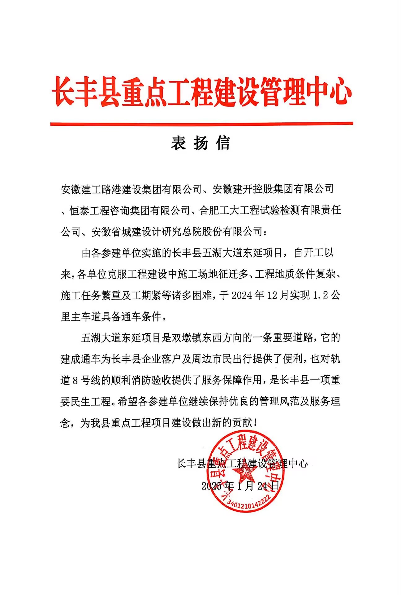 1月24日,建工路港長(zhǎng)豐縣五湖大道項(xiàng)目喜獲縣重點(diǎn)工程建設(shè)管理中心表?yè)P(yáng)信。