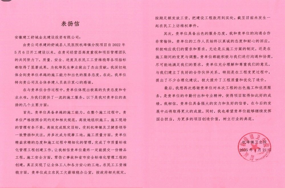 舒城縣人民醫(yī)院杭埠鎮(zhèn)分院項(xiàng)目收獲業(yè)主表揚(yáng)信。