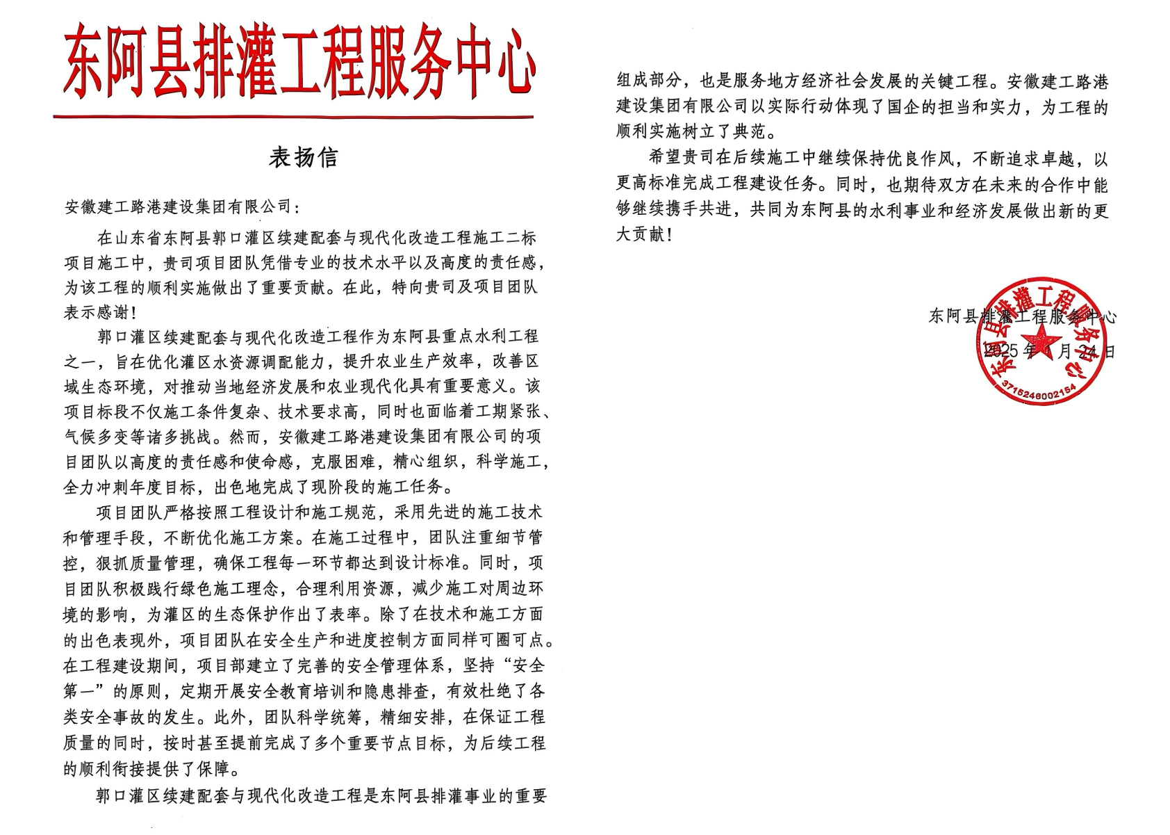 1月24日,建工路港山東東阿水利項(xiàng)目榮獲東阿縣排灌工程服務(wù)中心表揚(yáng)信。