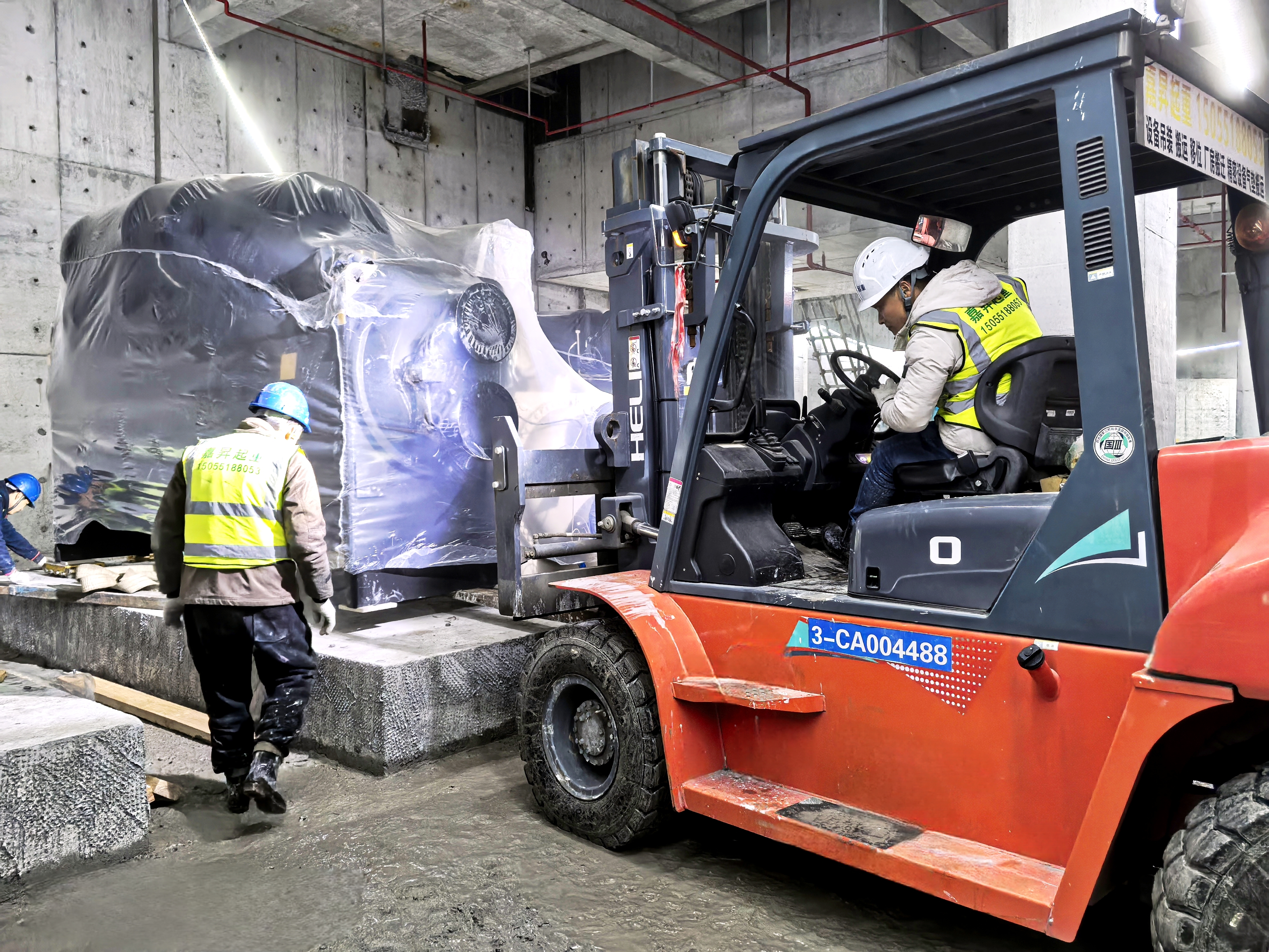 清晨7時許,施工現(xiàn)場已是一片繁忙而有序的景象。醒目的安全警戒線早已拉設(shè)完畢,擴音器中不斷傳來清晰而有力的安全提示語,為整個施工現(xiàn)場營造出濃厚的安全生產(chǎn)氛圍。隨著1臺130噸級重型吊車和數(shù)臺重型叉車的準(zhǔn)時進場,吊裝作業(yè)正式拉開了帷幕。在管理人員的精準(zhǔn)引導(dǎo)下,吊車巨大的起重臂緩緩升起,宛如一條鋼鐵巨龍般騰空而上,將一套套冷卻設(shè)備從吊裝口穩(wěn)穩(wěn)“銜”起,再精準(zhǔn)無誤地落到指定位置。機房內(nèi),兩臺叉車在工作人員的協(xié)同配合下靈活穿梭,將設(shè)備準(zhǔn)確安置到預(yù)定的安裝位置。整個吊裝過程井然有序,緊張而不失從容。夜幕降臨,寒風(fēng)刺骨,但現(xiàn)場依然是一片熱火朝天的大干景象,大伙兒似乎都已經(jīng)忘卻了疲憊和寒冷。終于,經(jīng)過全體人員近12個小時的不懈奮戰(zhàn)和連續(xù)作業(yè),所有重型設(shè)備均成功吊裝到位。隨著吊車和叉車有序撤離施工現(xiàn)場,本次吊裝作業(yè)圓滿完成。