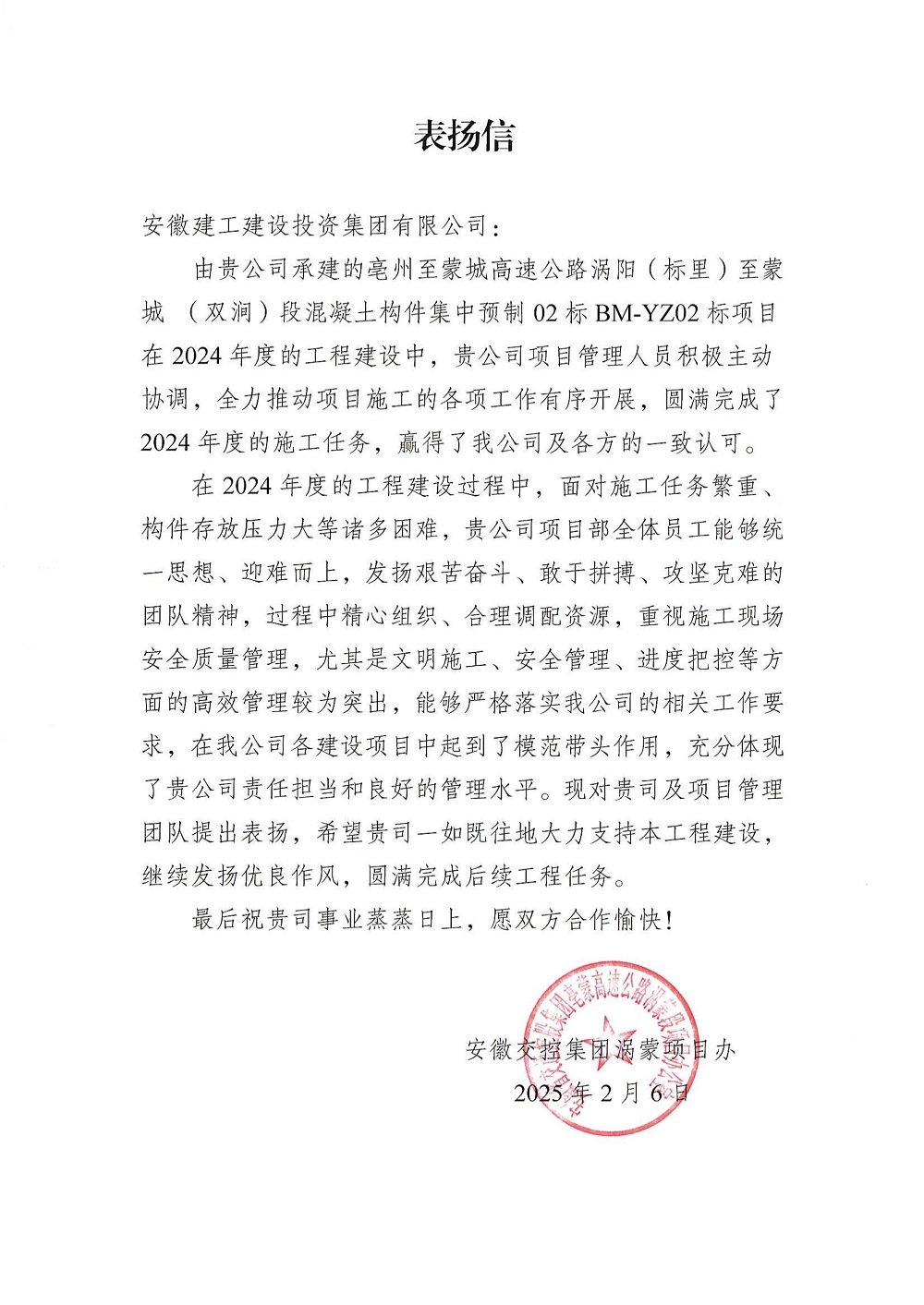 表?yè)P(yáng)信指出,亳蒙預(yù)制02標(biāo)項(xiàng)目在2024年度的工程建設(shè)過程中,面對(duì)施工任務(wù)繁重、構(gòu)件存放壓力大等諸多困難,項(xiàng)目部全體員工能夠統(tǒng)一思想、迎難而上,發(fā)揚(yáng)艱苦奮斗、敢于拼搏、攻堅(jiān)克難的團(tuán)隊(duì)精神,過程中精心組織、合理調(diào)配資源,重視施工現(xiàn)場(chǎng)安全質(zhì)量管理,尤其是文明施工、安全管理、進(jìn)度把控等方面的高效管理較為突出,能夠嚴(yán)格落實(shí)業(yè)主單位的相關(guān)工作要求,在各建設(shè)項(xiàng)目中起到了模范帶頭作用,項(xiàng)目管理人員積極主動(dòng)協(xié)調(diào),全力推動(dòng)項(xiàng)目施工的各項(xiàng)工作有序開展,圓滿完成了2024年度的施工任務(wù),贏得了業(yè)主單位及各方的一致認(rèn)可。