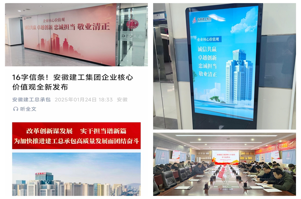 創(chuàng)新載體,增強(qiáng)學(xué)習(xí)宣貫實效。公司堅持“線上線下”雙管齊下,充分運(yùn)用官微、官網(wǎng)等線上平臺,第一時間推送《16字信條!安徽建工集團(tuán)企業(yè)核心價值觀全新發(fā)布》學(xué)習(xí)資料,將核心價值觀融入公司宣傳圖標(biāo);線下利用宣傳欄、電子屏、海報等載體,廣泛宣傳營造氛圍,增強(qiáng)學(xué)習(xí)的吸引力感染力。