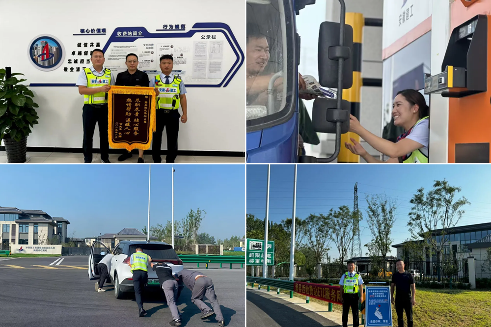 在蕭縣西收費(fèi)站,一名收費(fèi)員于暴雨中主動(dòng)化身“修車工”,協(xié)助故障車輛脫困,車主事后專程送來(lái)錦旗致謝;濉溪北收費(fèi)站工作人員在38℃高溫下,合力將一輛虧電新能源車推行300米至充電樁,及時(shí)化解困境。車主感動(dòng)地表示:“比空調(diào)更涼快的是你們的熱心!”