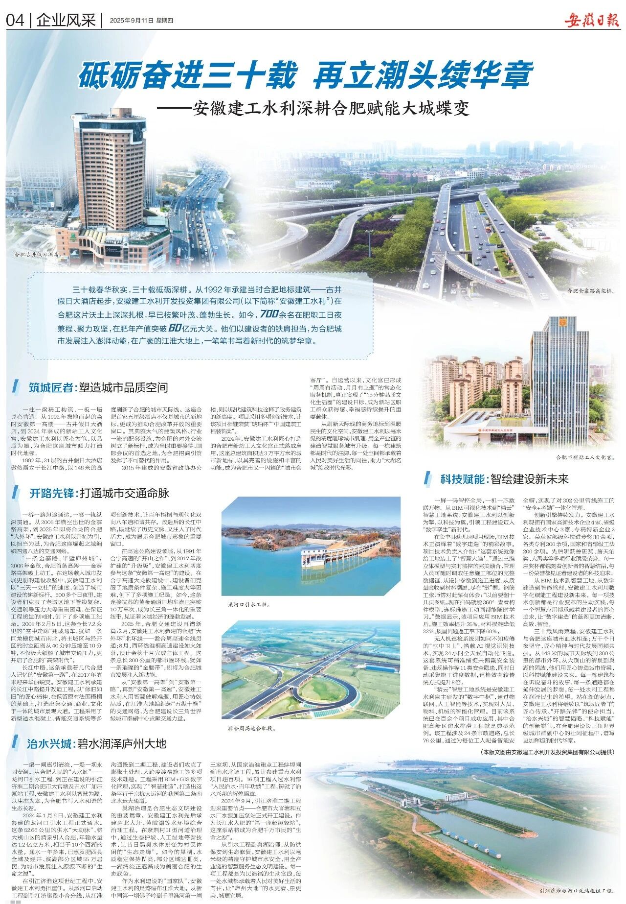 三十載風(fēng)雨兼程,安徽建工水利與合肥這座城市血脈相連;萬千個日夜堅(jiān)守,匠心精神與時代發(fā)展同頻共振。從148米的城市天際線到300公里的都市外環(huán),從大別山的清泉到巢湖的碧波,他們用匠心鑄造城市脊梁,以科技賦能建設(shè)未來。每一棟建筑都在訴說奮斗的故事,每一條道路都在延伸發(fā)展的夢想,每一處水利工程都在潤澤民生的希望。站在新的起點(diǎn),安徽建工水利將繼續(xù)以“筑城匠者”的匠心傳承、“開路先鋒”的使命擔(dān)當(dāng)、“治水興城”的智慧韜略、“科技賦能”的創(chuàng)新銳氣,在合肥建設(shè)長三角世界級城市群副中心的壯闊征程中,譜寫更加輝煌的時代華章。