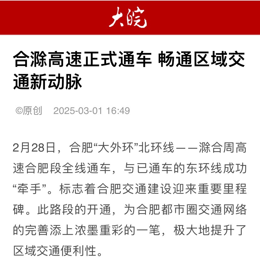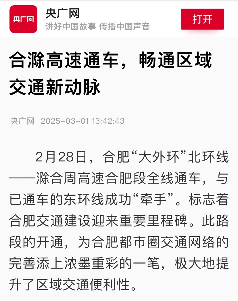 2月28日,建工水利承建的合肥“大外環(huán)”北環(huán)線——滁合周高速合肥段全線通車,與已通車的東環(huán)線成功“牽手”,受到央廣網(wǎng)、大皖新聞等主流媒體關(guān)注報道。