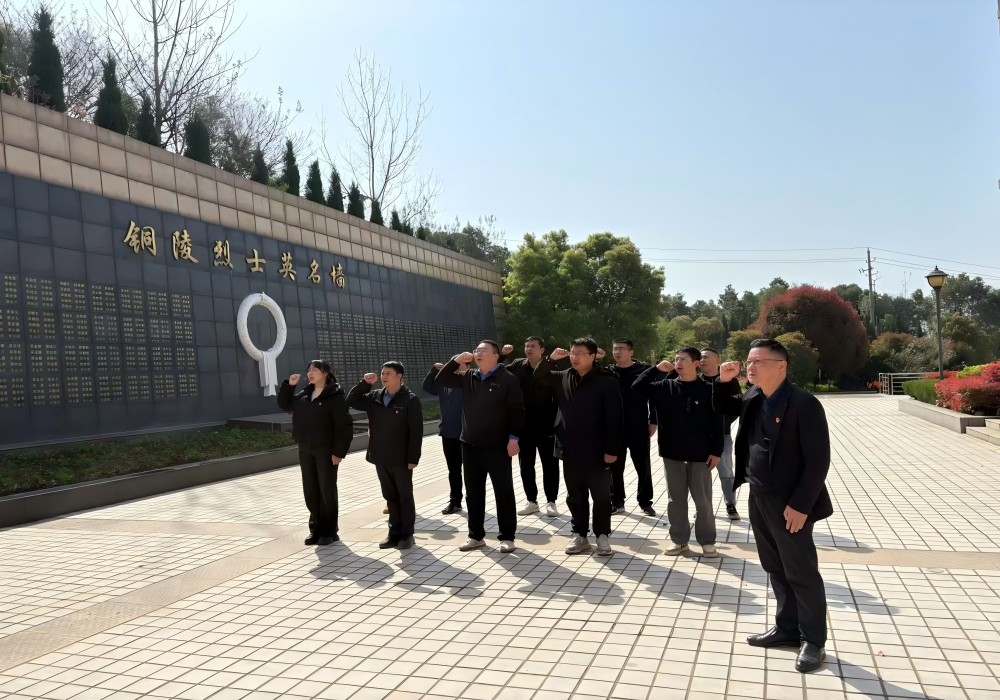 全體參與人員身著黑色上衣,列隊前往烈士紀(jì)念塔敬獻(xiàn)鮮花,集體默哀致敬。隨后,我們移步烈士陵園,在黨旗下重溫入黨誓詞,鏗鏘誓言回蕩于蒼松翠柏之間,彰顯新時代黨員的堅定信念。最后,在烈士紀(jì)念館中,我們跟隨講解員回顧銅陵地區(qū)革命斗爭歷史,通過珍貴文物和影像資料深切感悟先烈英勇無畏的奉獻(xiàn)精神。