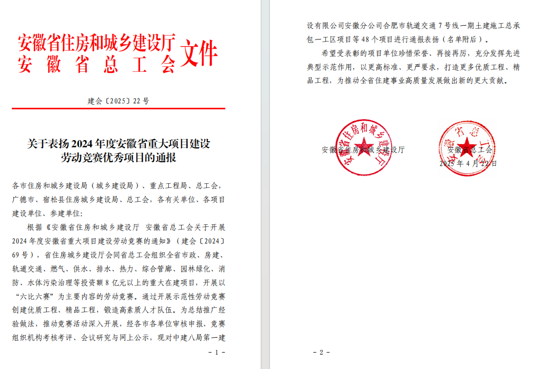 近日,安徽省住房和城鄉(xiāng)建設(shè)廳、安徽省總工會(huì)聯(lián)合發(fā)布《關(guān)于表?yè)P(yáng) 2024 年度安徽省重大項(xiàng)目建設(shè)勞動(dòng)競(jìng)賽優(yōu)秀項(xiàng)目的通報(bào)》,公司潭沖河家園 D、E 地塊 EPC 總承包項(xiàng)目和徐淮阜高速宿州段路基工程 02 標(biāo)項(xiàng)目表現(xiàn)突出,成功入選優(yōu)秀項(xiàng)目名單。