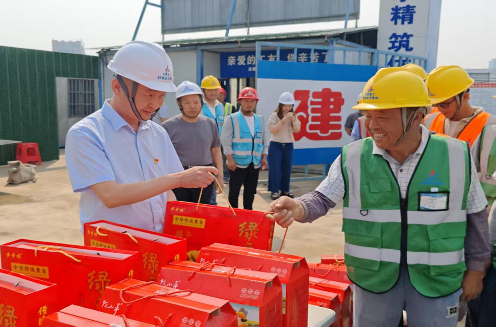 一線送暖,工地粽香話發(fā)展。楊金龍一行抵達(dá)施工現(xiàn)場,為奮戰(zhàn)在一線的工人送上粽子、咸鴨蛋、綠豆糕等端午慰問品,向他們致以節(jié)日的問候和誠摯的感謝,并叮囑大家在高溫天氣下要注意防暑降溫,確保安全生產(chǎn)。同時,楊金龍圍繞項目建設(shè)進(jìn)度、質(zhì)量管控、安全生產(chǎn)等方面開展實地調(diào)研,與項目負(fù)責(zé)人深入探討并提出指導(dǎo)性意見。