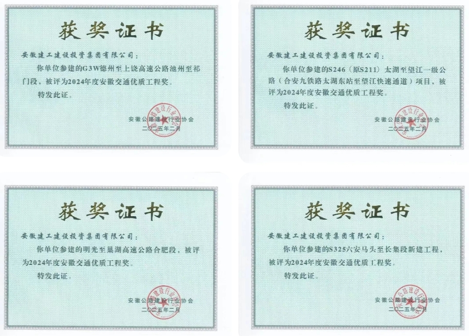 2025年6月17日,安徽公路建設(shè)行業(yè)協(xié)會第五次會員代表大會暨2024年度安徽交通優(yōu)質(zhì)工程獎頒獎大會在合肥召開。建工建投公司憑借卓越的工程建設(shè)能力,榮獲四項安徽交通優(yōu)質(zhì)工程獎!