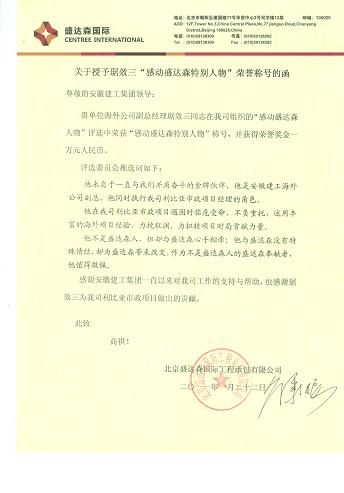日前,北京盛達(dá)森國(guó)際工程承包有限公司致函安徽建工集團(tuán),盛贊海外公司副總經(jīng)理琚效三在利比亞市政項(xiàng)目做出的突出貢獻(xiàn)。北京盛達(dá)森國(guó)際工程承包有限公司“感動(dòng)盛達(dá)森特別人物”評(píng)選委員會(huì)授予琚效三副總經(jīng)理“感動(dòng)盛達(dá)森特別人物”榮譽(yù)稱號(hào)和一萬元人民幣榮譽(yù)獎(jiǎng)金。推選詞為:“他來自于一直與我們并肩奮斗的金牌伙伴,他是安徽建工海外公司副總,他同時(shí)執(zhí)行我司利比亞市政項(xiàng)目經(jīng)理的角色。他在我司利比亞市政項(xiàng)目遇困時(shí)臨危受命、不負(fù)重托,運(yùn)用豐富的海外項(xiàng)目經(jīng)驗(yàn),力挽狂瀾,為扭轉(zhuǎn)項(xiàng)目時(shí)局貢獻(xiàn)力量。他不是盛達(dá)森人,但卻與盛達(dá)森心手相牽;他與盛達(dá)森沒有特殊情結(jié),卻為盛達(dá)森帶來改變,作為不是盛達(dá)森人的盛達(dá)森奉獻(xiàn)者,他值得敬佩?!?/DIV>