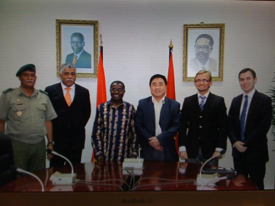 11月21日,中國駐安哥拉大使張伯倫先生設(shè)宴宴請了考察團一行。胡董事長一行還分別與在安哥拉合作的三家公司進行了業(yè)務(wù)洽談,并先后與JHS公司以及Solida投資公司簽訂了3900萬美元的承包工程合同