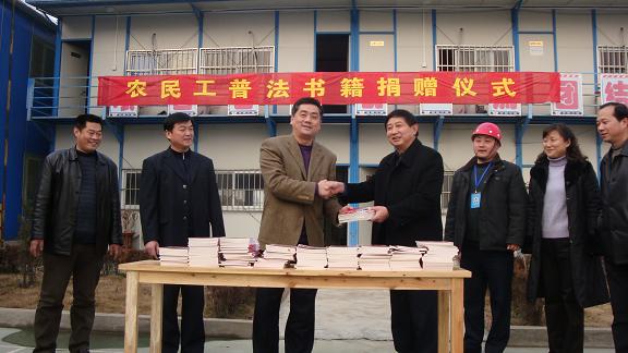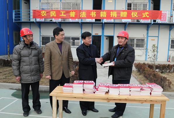 2010年元月28日下午,合肥市人民檢察院向安徽建工農(nóng)民工業(yè)余學(xué)校捐贈農(nóng)民工普法書籍儀式在安徽三建美亞光電項目部舉行。市檢察院黨組成員、副檢察長黃世斌,黨組成員、政治部主任童興芝等一行四人,看望慰問農(nóng)民工兄弟,宣傳農(nóng)民工法律維權(quán)知識,并現(xiàn)場捐贈《農(nóng)民工普法讀本》200本。集團公司副總經(jīng)理、集團農(nóng)民工業(yè)余學(xué)校常務(wù)副校長王禮義,集團人力資源部主任胡建英,安徽三建紀委書記周湃等出席捐贈儀式。